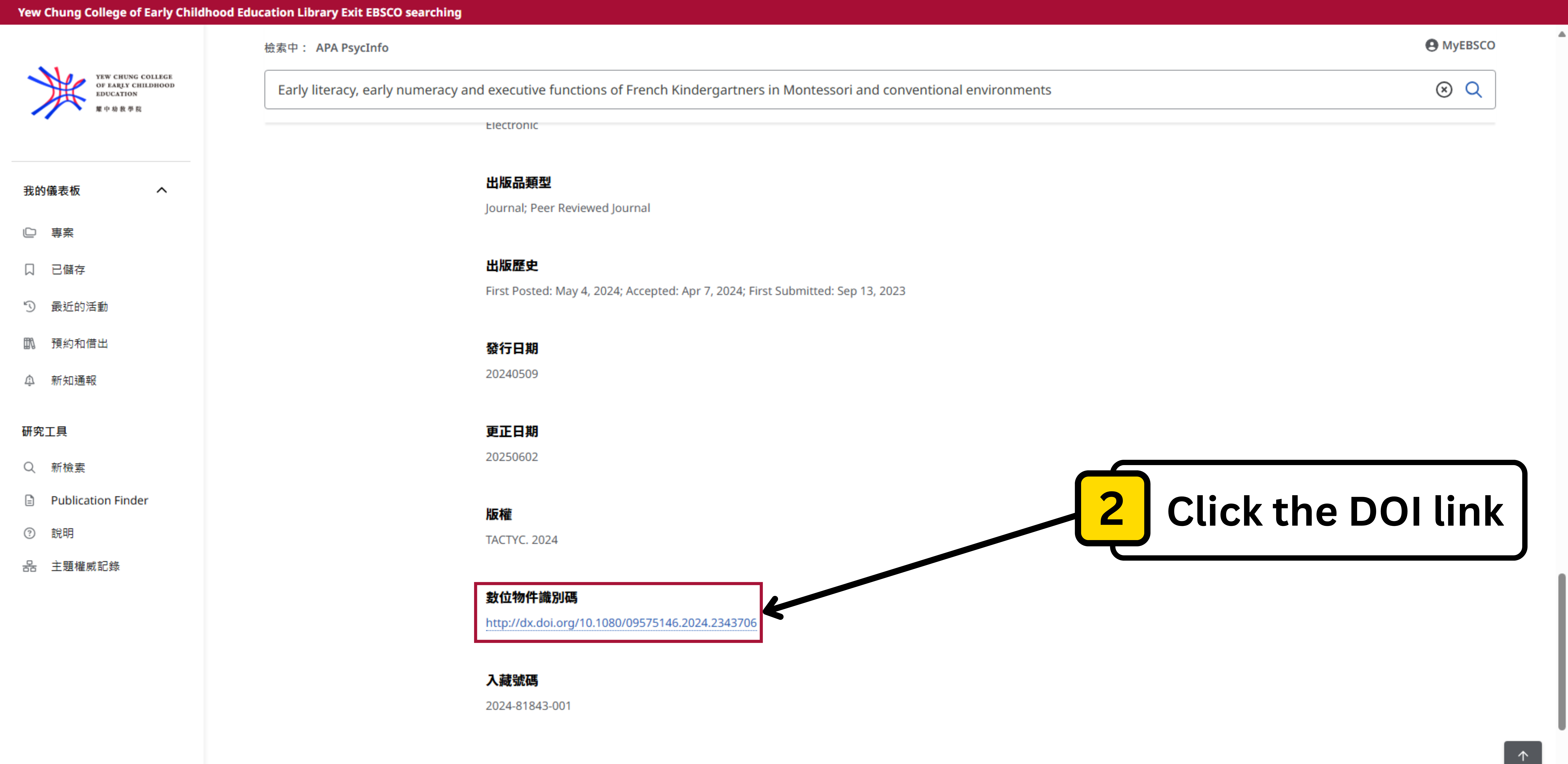 - Locate the article’s DOI (Digital Object Identifier) in the full record within APA PsycINFO. Clicking the DOI will direct you to the publisher’s website.